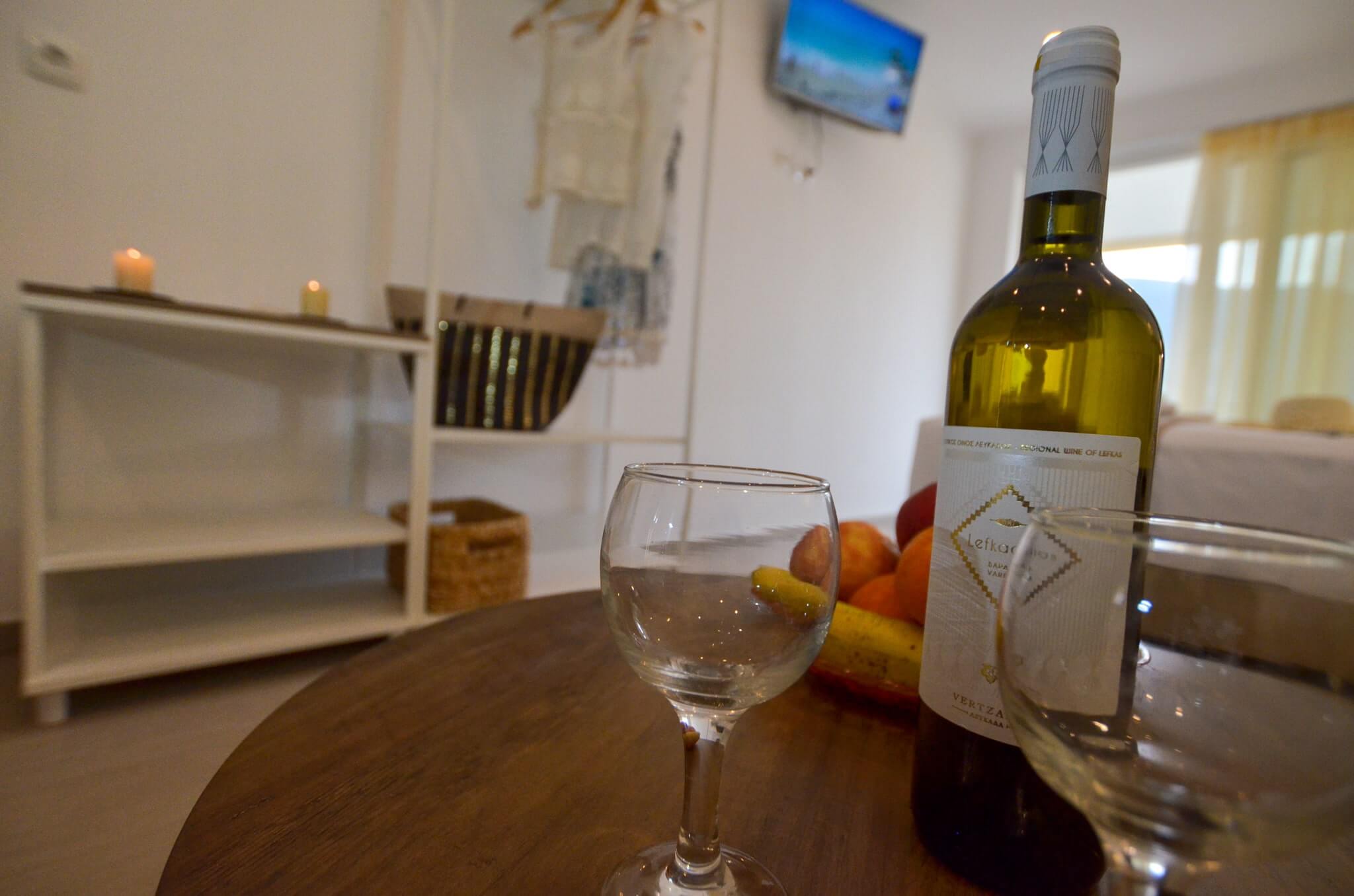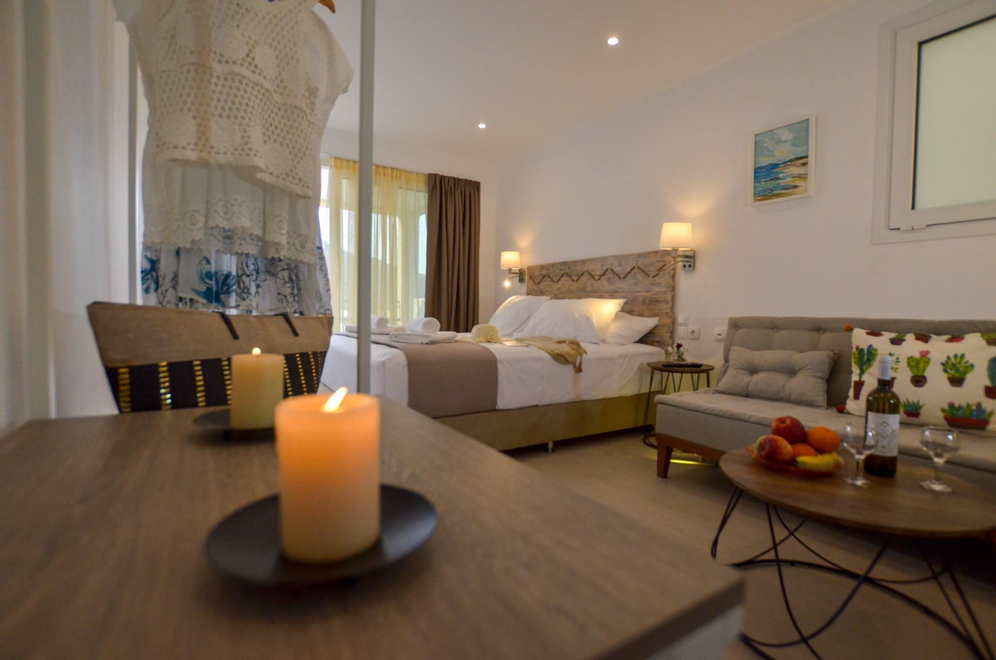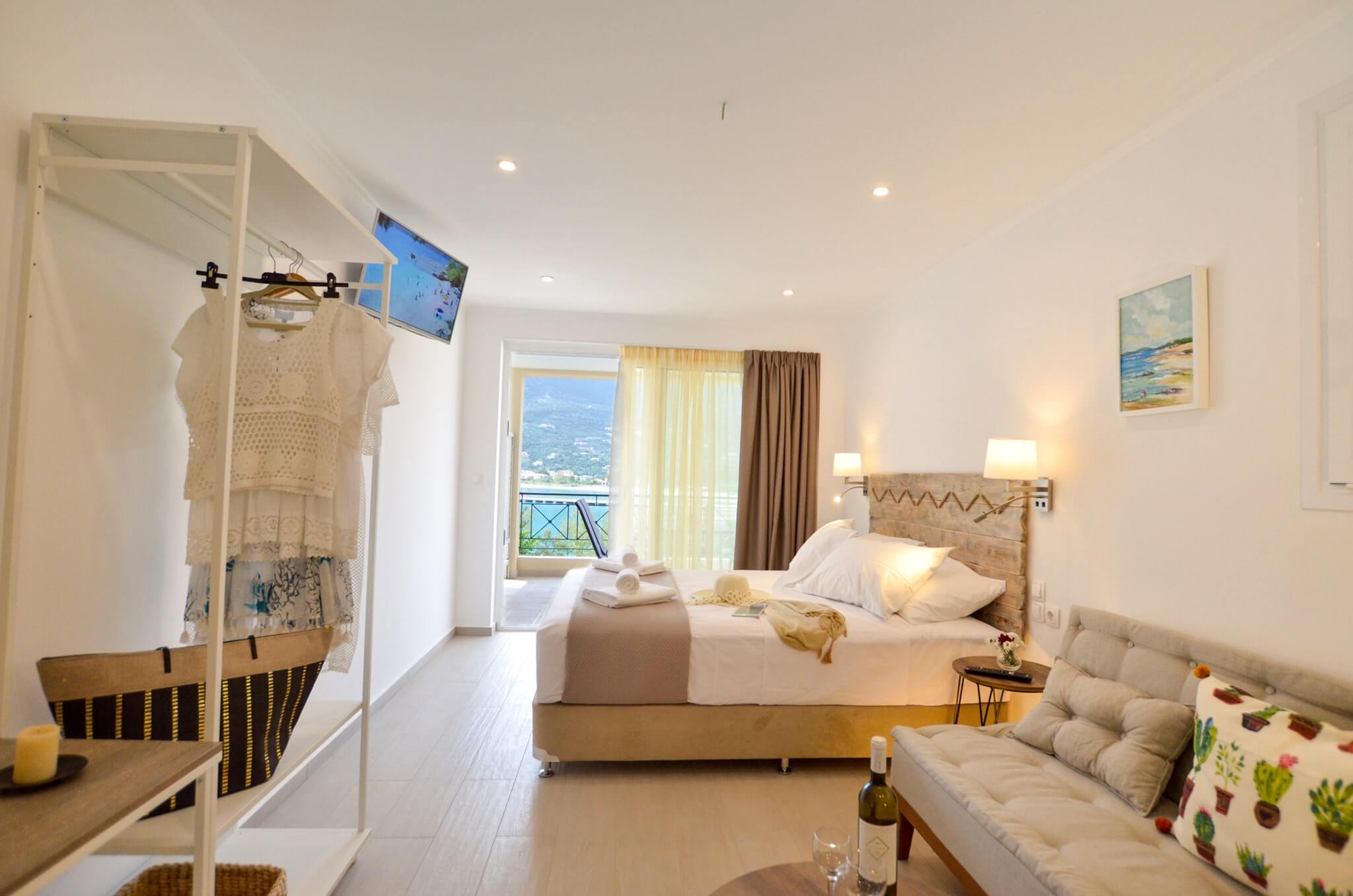 Superior Studio (1st floor) is a 26 SQM and is mainly addressed to families of two or three ­members, groups or even couples who seek extra space and comfort in their room. The room features a large bed (King size) and a double size sofa bed. The room is overlooking the village of Vasiliki, has beautiful sea view. The large terrace offers a relaxing experience on summer nights.